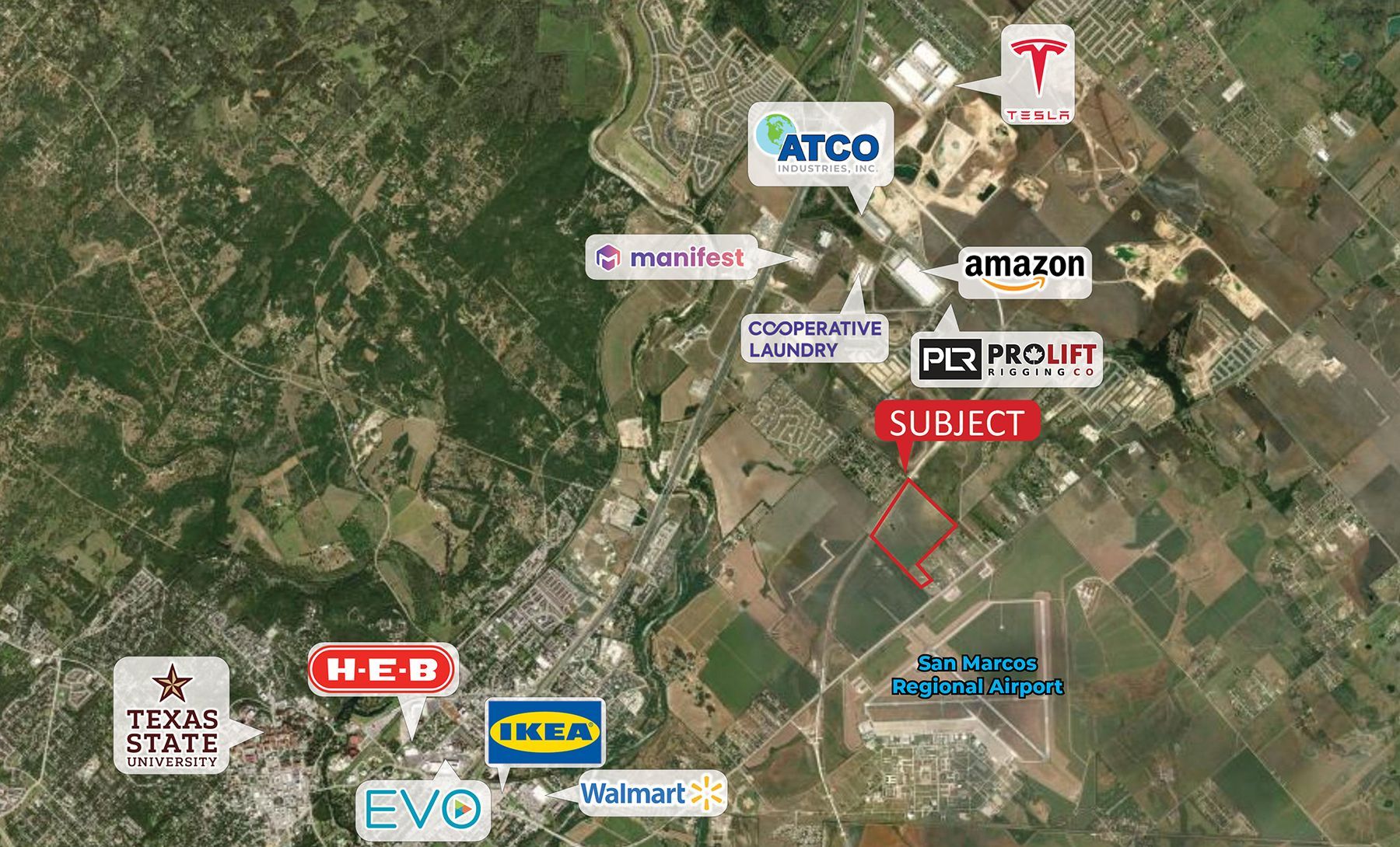 LOCATION: ±102 acres located on the east side of FM 110 and Highway 21 in San Marcos across from the San Marcos Regional Airport. It is strategically located along the 50-mile stretch of IH-35 within the Texas Innovation Corridor between Austin and San antonio.
