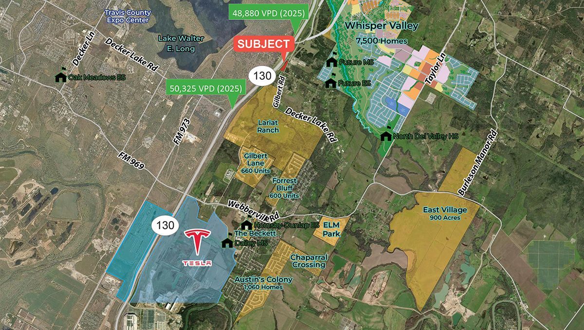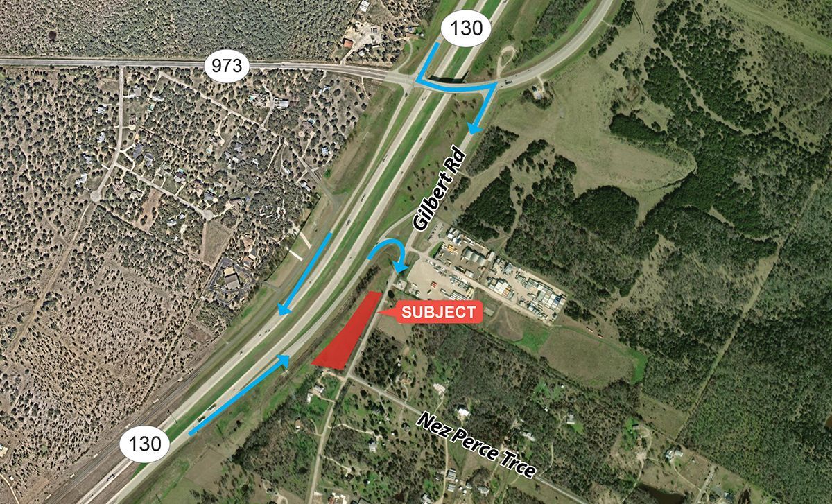 ACCESS: From northbound SH-130, exit FM 973. Right lane will take you southbound on Gilbert Road. From southbound SH-130, or FM 973, go east on FM973 and turn right on Gilbert Road (two-way road).