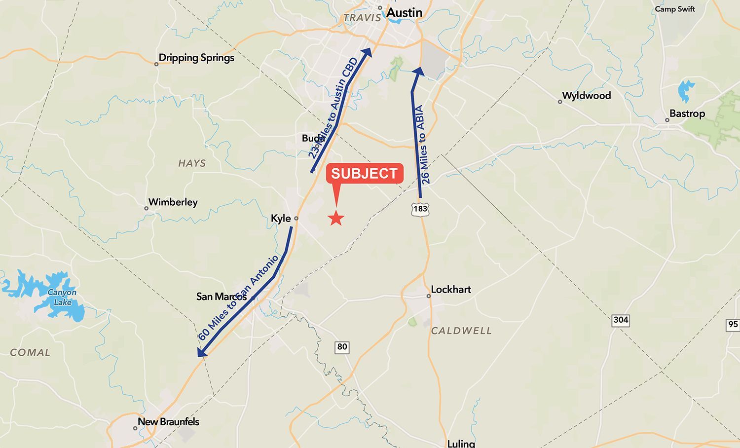 PROPERTY: The Property is well located on High Road, a 6-mile direct connection between I-35 and Hwy 21. It is 3.5 miles east of I-35 and is surrounded by existing and planned residential projects. Within 5 miles from the site, you have a major regional hospital (Ascension Seton Hays), HEB Plus, Walmart, Costco, Target, Lowes, Home Depot, Austin Community College.